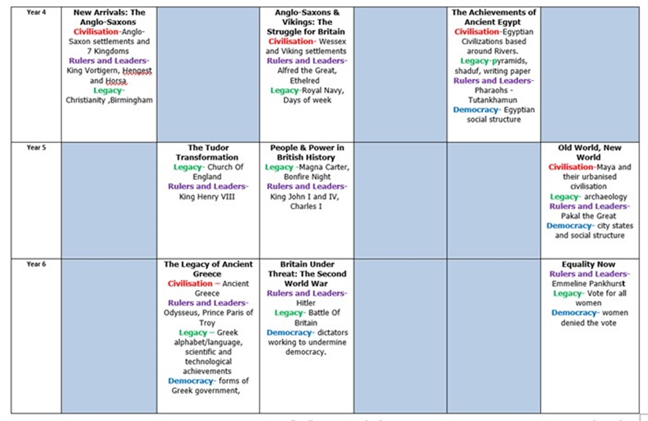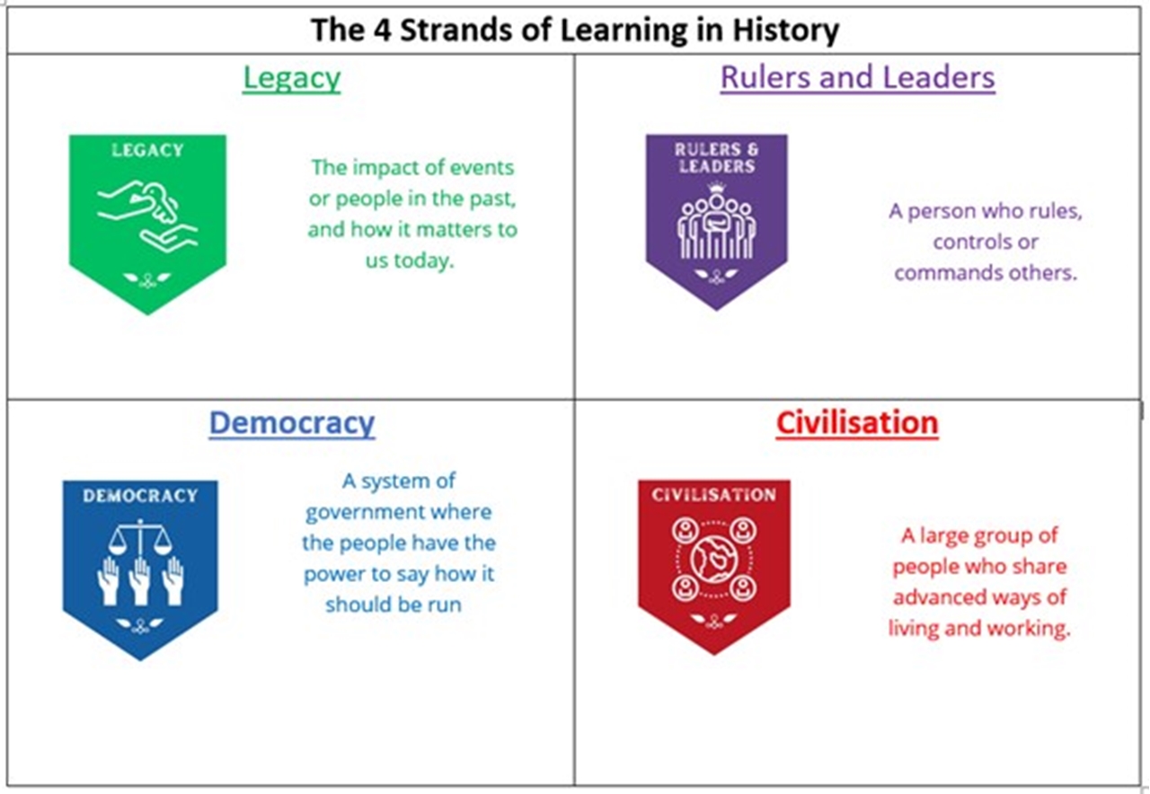 To prepare pupils for their future learning in History, our curriculum aims to introduce them to key substantive concepts which include civilisations, rulers and leaders, legacy and democracy. Our curriculum also embeds children’s disciplinary knowledge through the concepts of cause and effect, similarity and difference, historical significance, evidence and chronology.