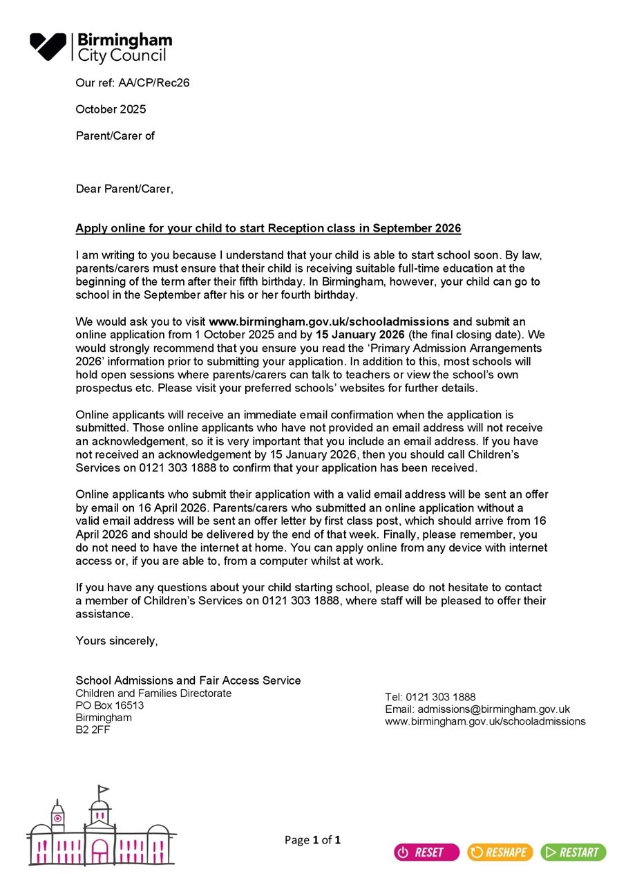 Friday 10th October | SCHOOL | Reception parents are welcome to join us for weekly reading time on Friday 14:50-15:20. Please can parents wait outside the Linden Road gate a few minutes before 14:50 for staff to escort you to the Cadbury Building. |