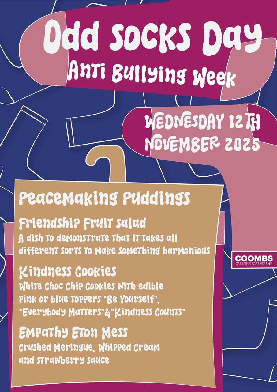 Next Wednesday we have out Odd Socks Day dessert menu for Anti- Bullying Week.