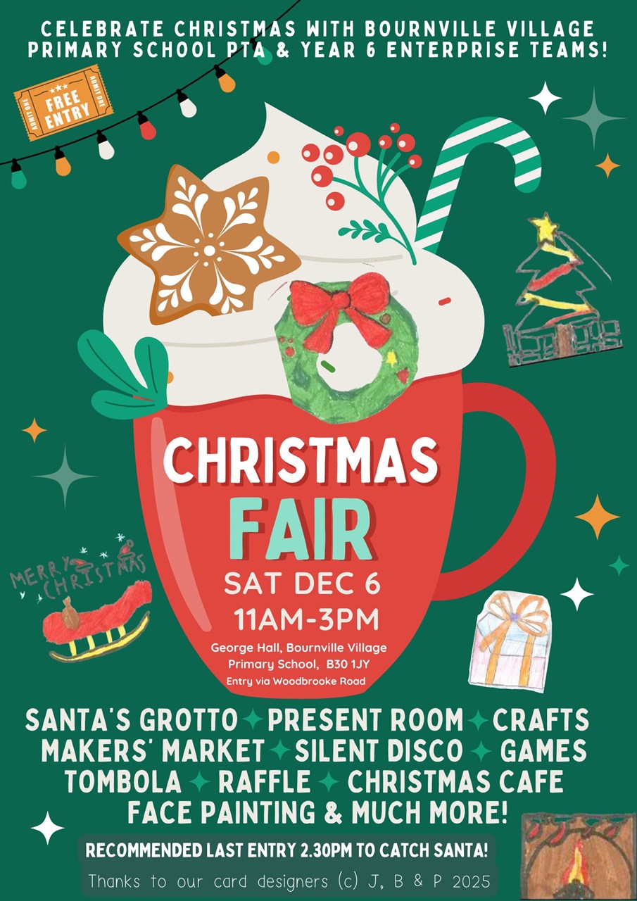 Christmas Fair - Saturday 6th December please do pop the date in your diary now so that the event is well attended and keeps the Year 6 team busy - after all - it is what you would want to see happen when your kids are in Year 6.