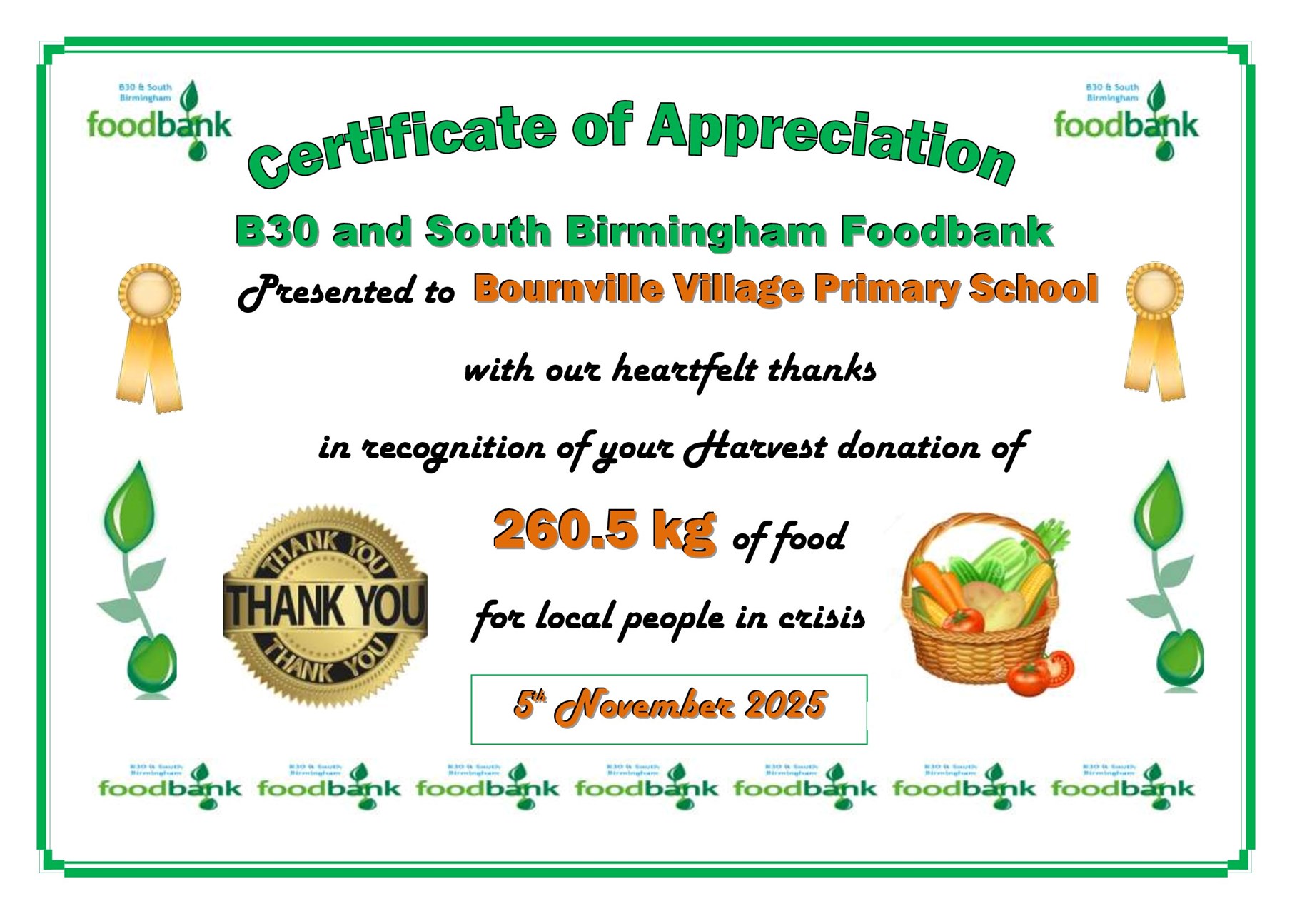 Many thanks to everyone who donated food at the School Harvest Service in St Francis Church. A large donation of 260.5 kg was given to B30 and South Birmingham Foodbank from BVPS, St Francis Primary School and St Francis Church. Thank you for your support.