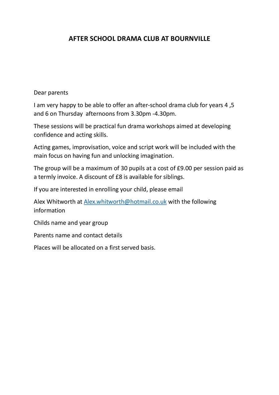There are also a few spaces left on the Drama club that is held at BVP on Thursdays afterschool. This is for year 4/5& 6 only. Have a look at the details below and if interested, contact the club directly.
