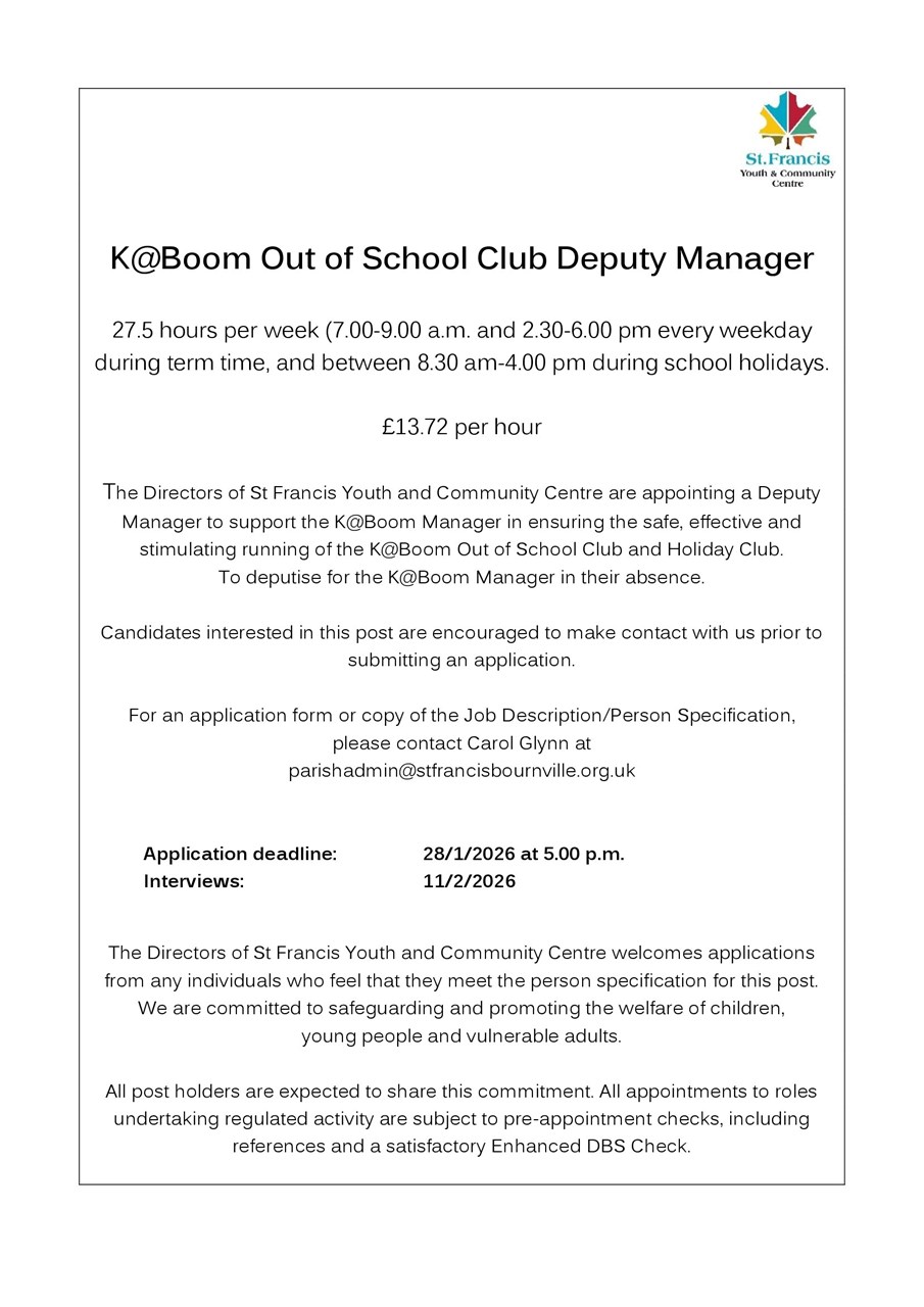 We have a vacancy for a deputy manager at K@Boom, our Out of School Club. Please see below for more information.